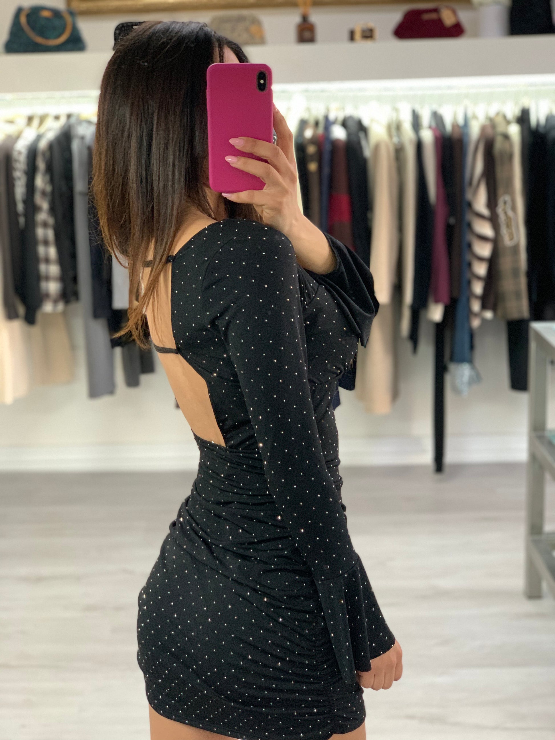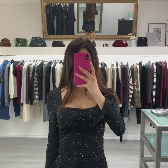 Abito nero con brillantini argento drappeggiato con maniche scampanate scollato sulla schiena Taglia unica