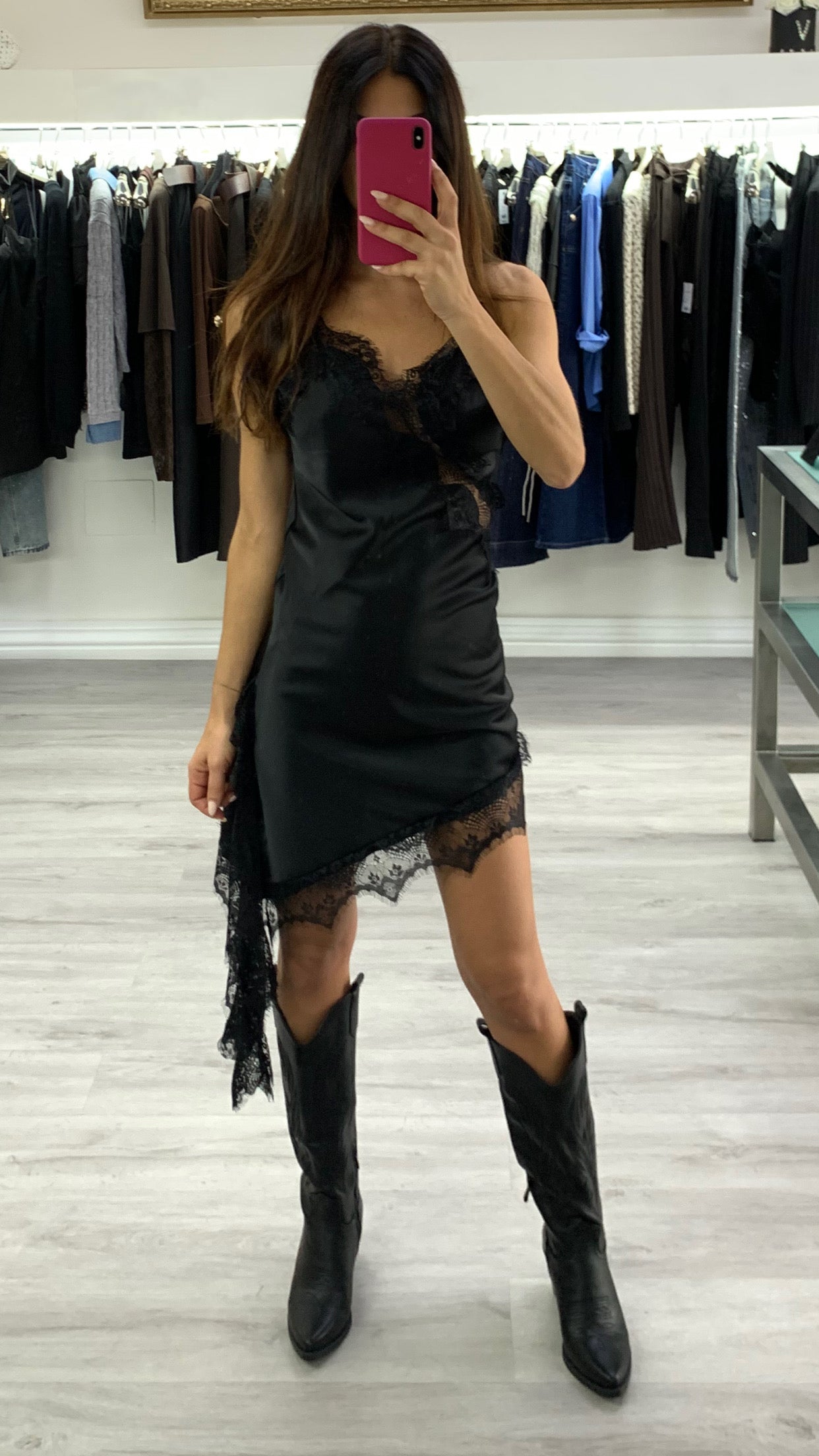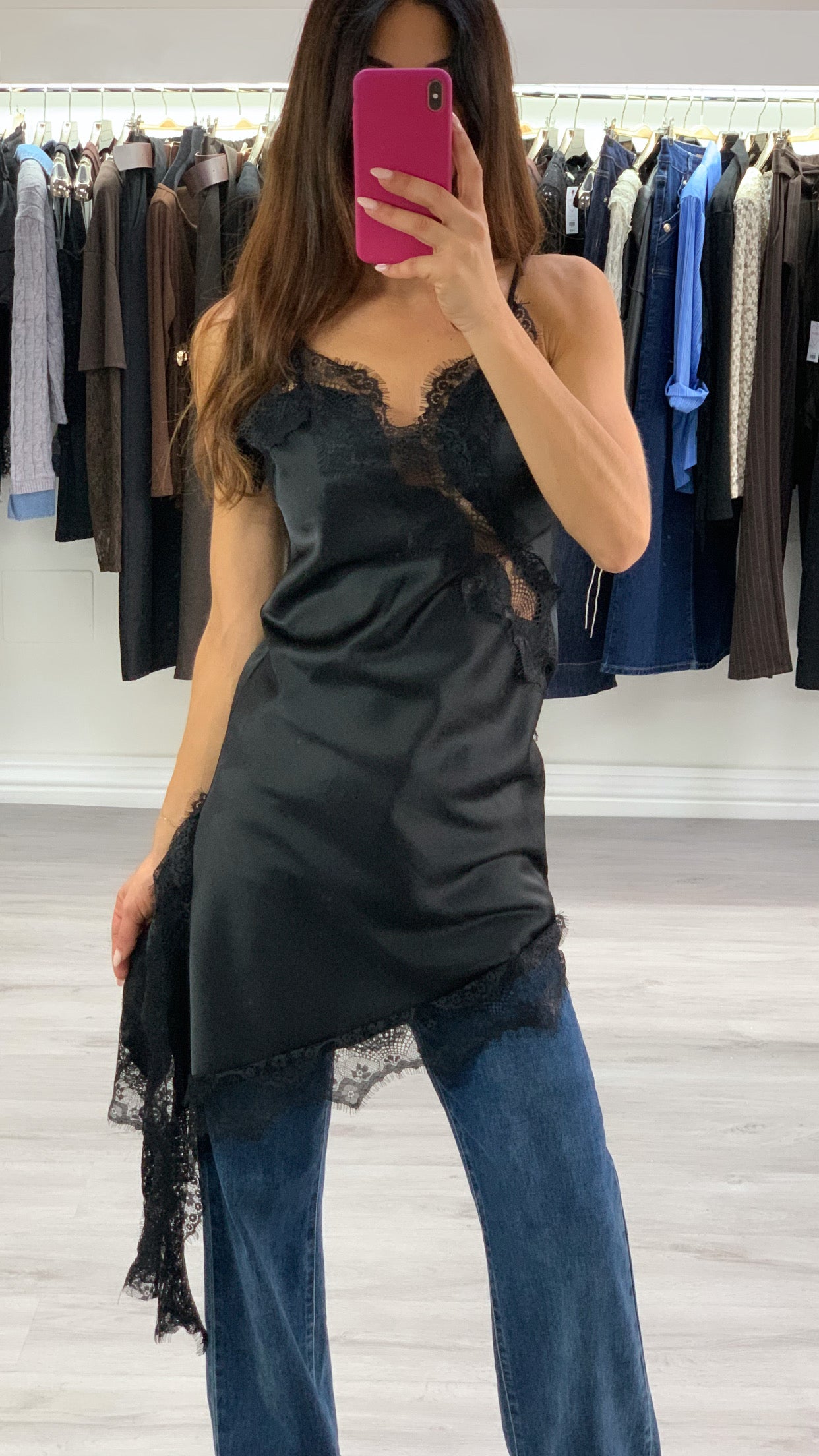 Abito in simil raso e pizzo modello asimmetrico con spalline sottili Taglia unica