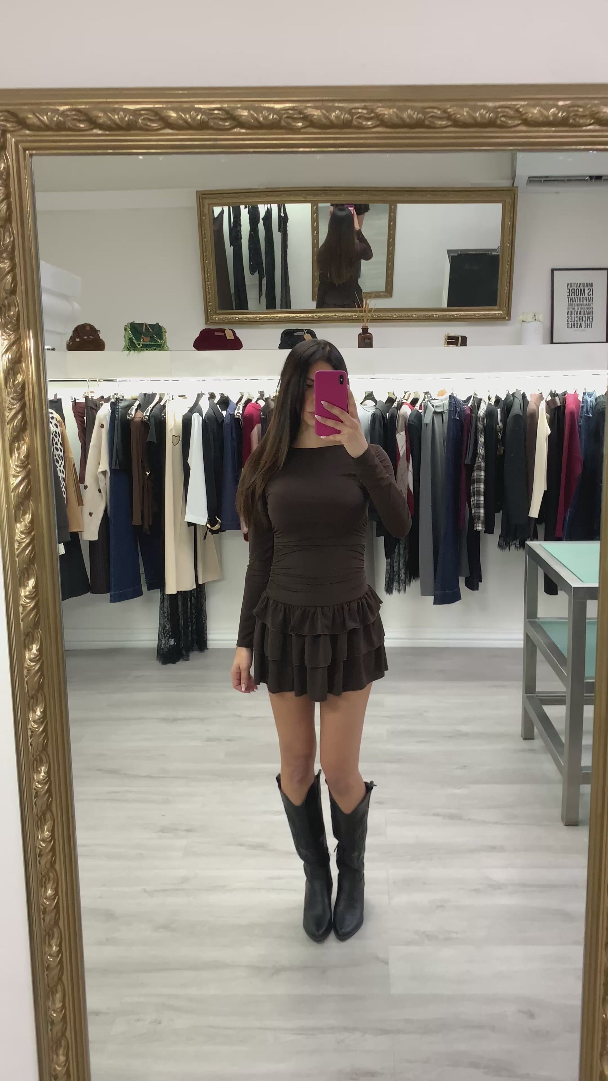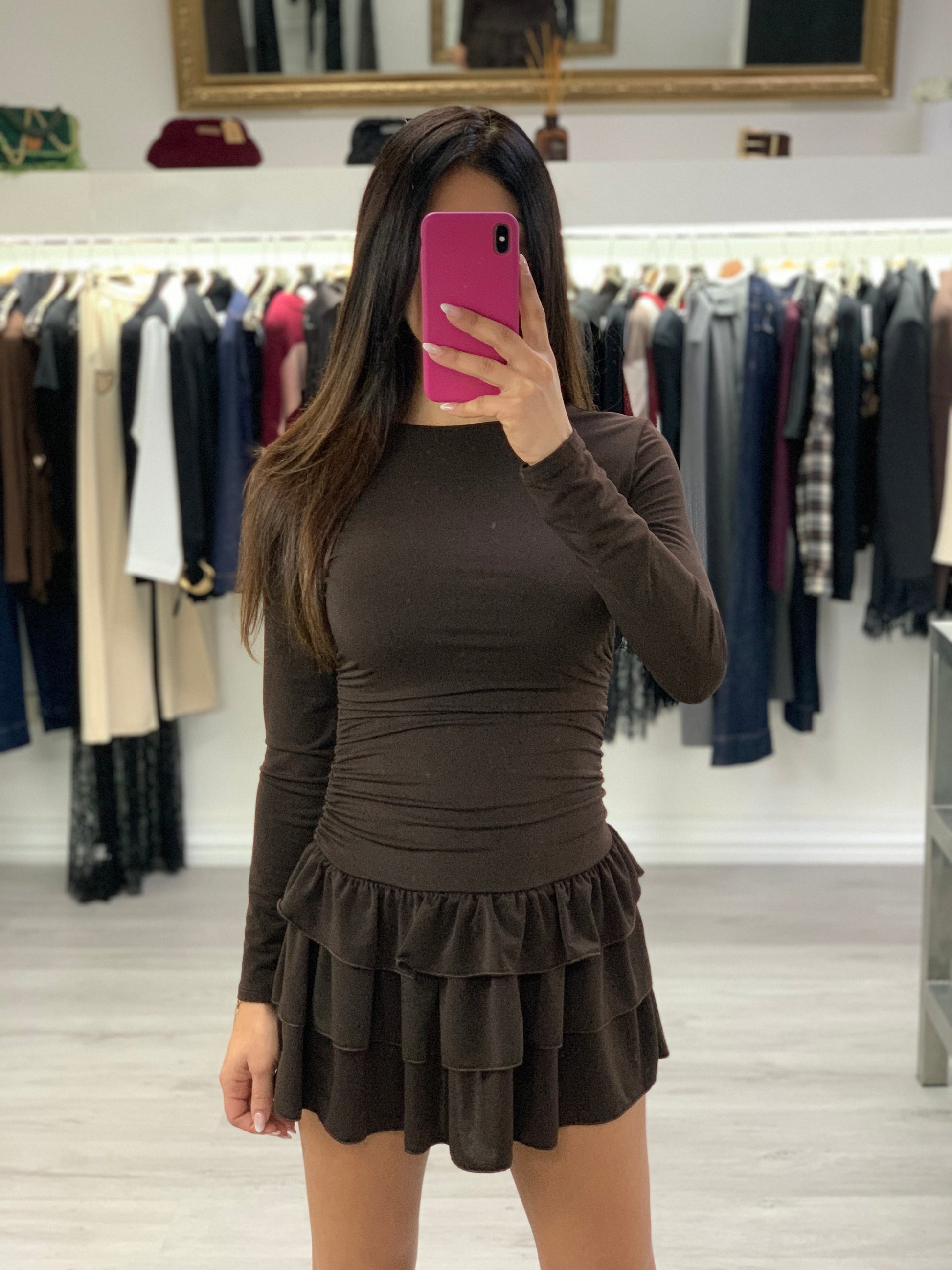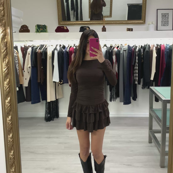 Mini abito tessuto elasticizzato colore marrone con gonna a balze Taglia unica