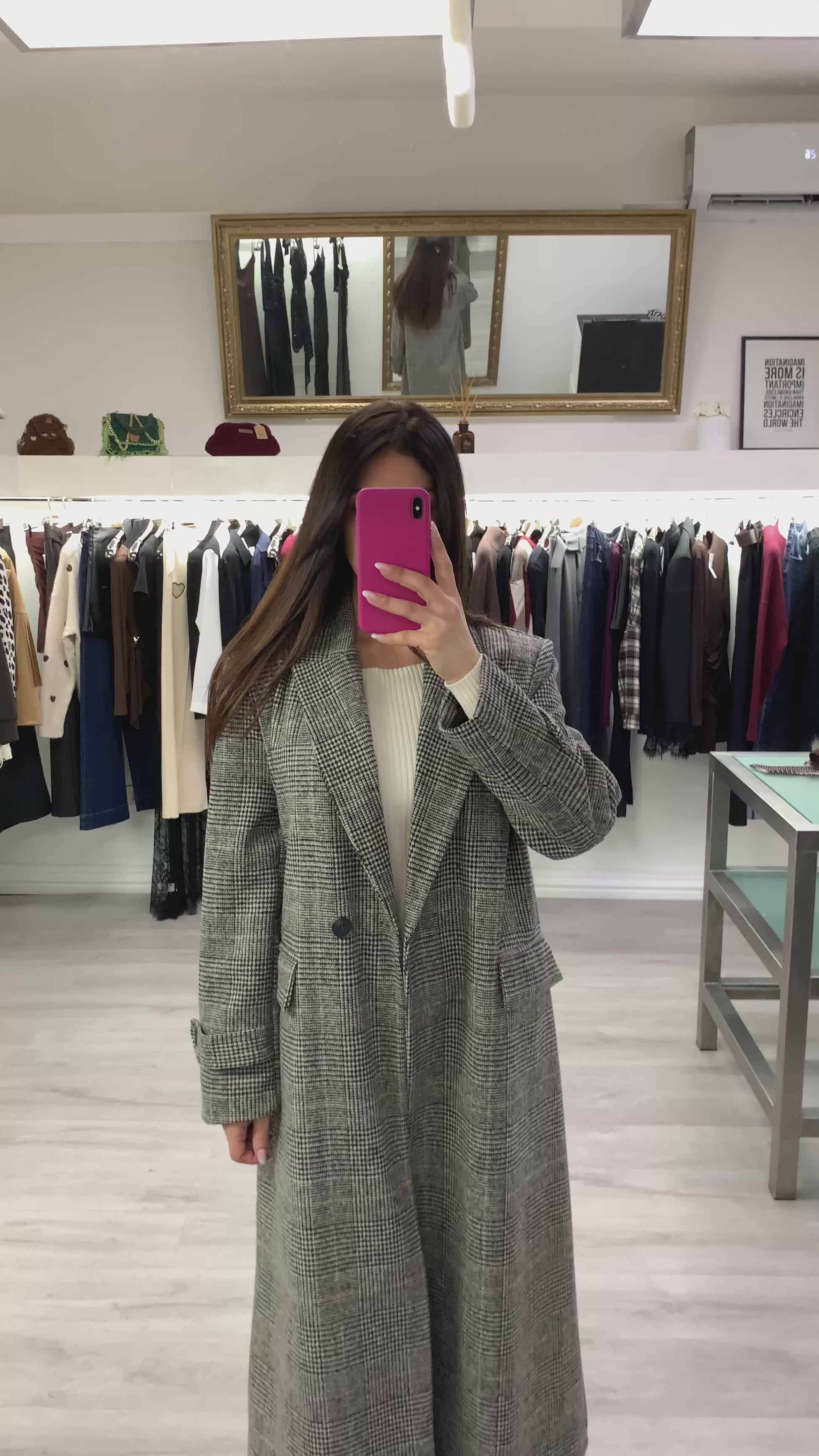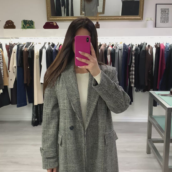 Cappotto lungo doppiopetto modello oversize a quadri colore grigio tendente al tortora si può abbinare una cintura in vita (cintura della foto non compresa) per renderlo più avvitato Taglia unica
