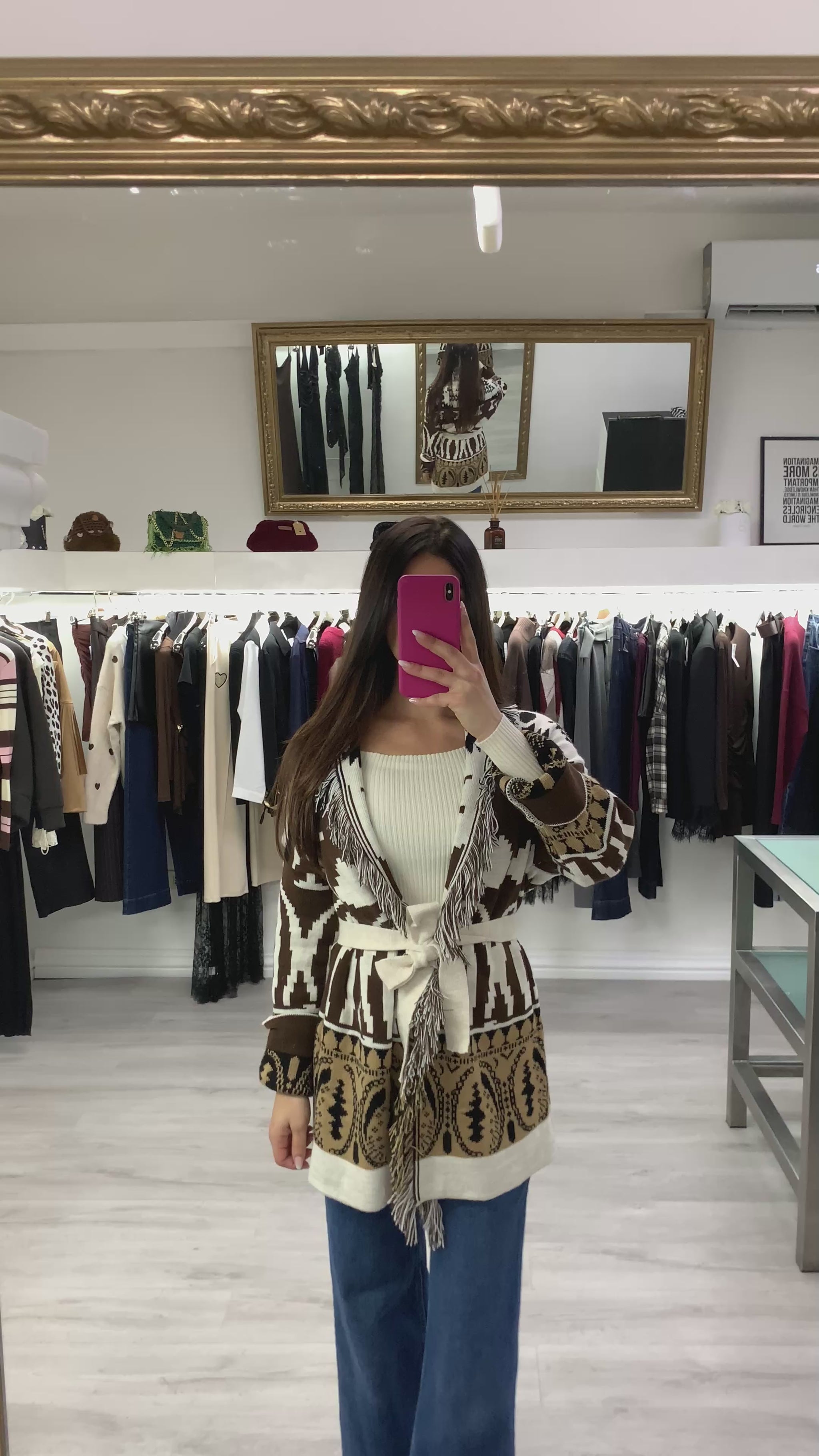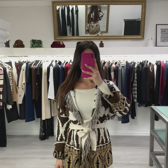 Cardigan fantasia dai colori bianco marrone beige e nero con frange e cintura Taglia unica