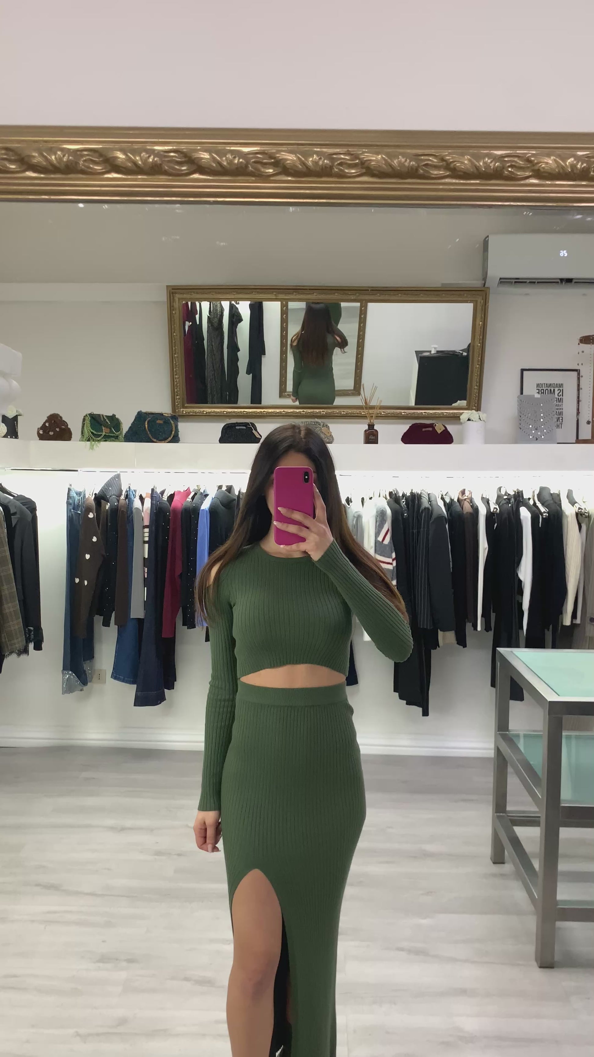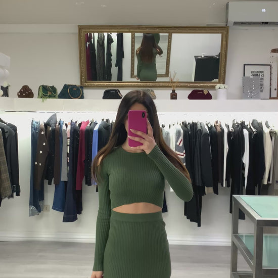 Completo in maglia a coste elasticizzato colore verde militare composto da top crop con dettaglio cutout sulle spalle e gonna lunga con spacco frontale Taglia unica