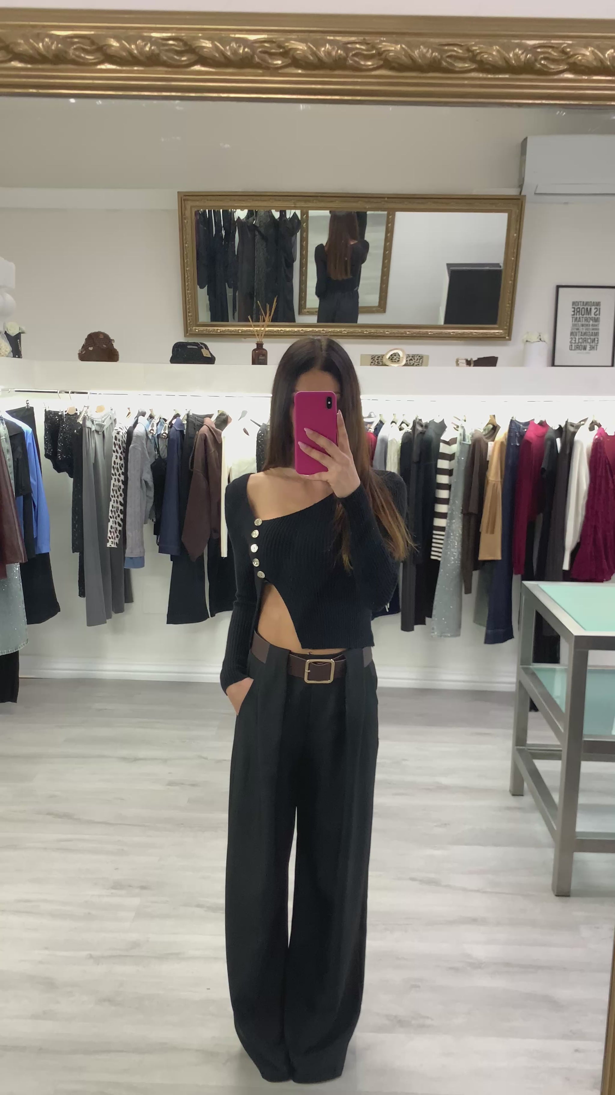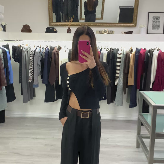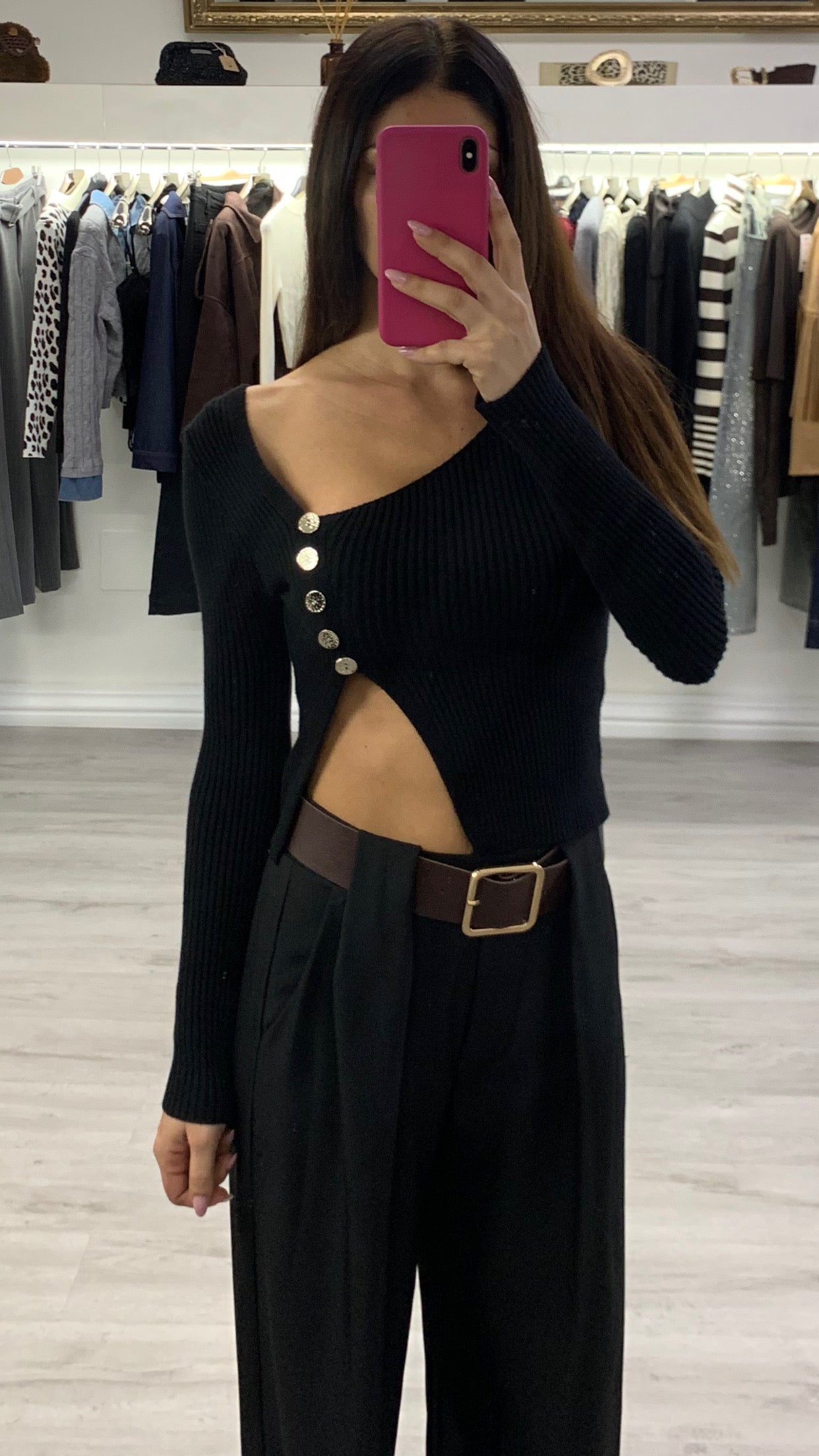 Maglioncino crop nero a costina con bottoni dorati Taglia unica