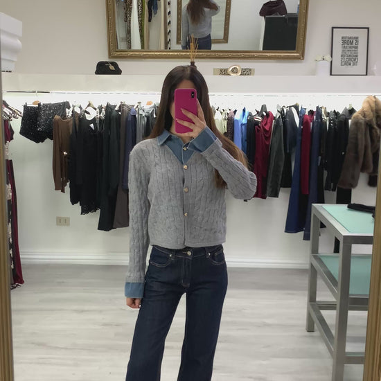 Maglia grigia a trecce con colletto e polsini in jeans e bottoni dorati Taglia unica