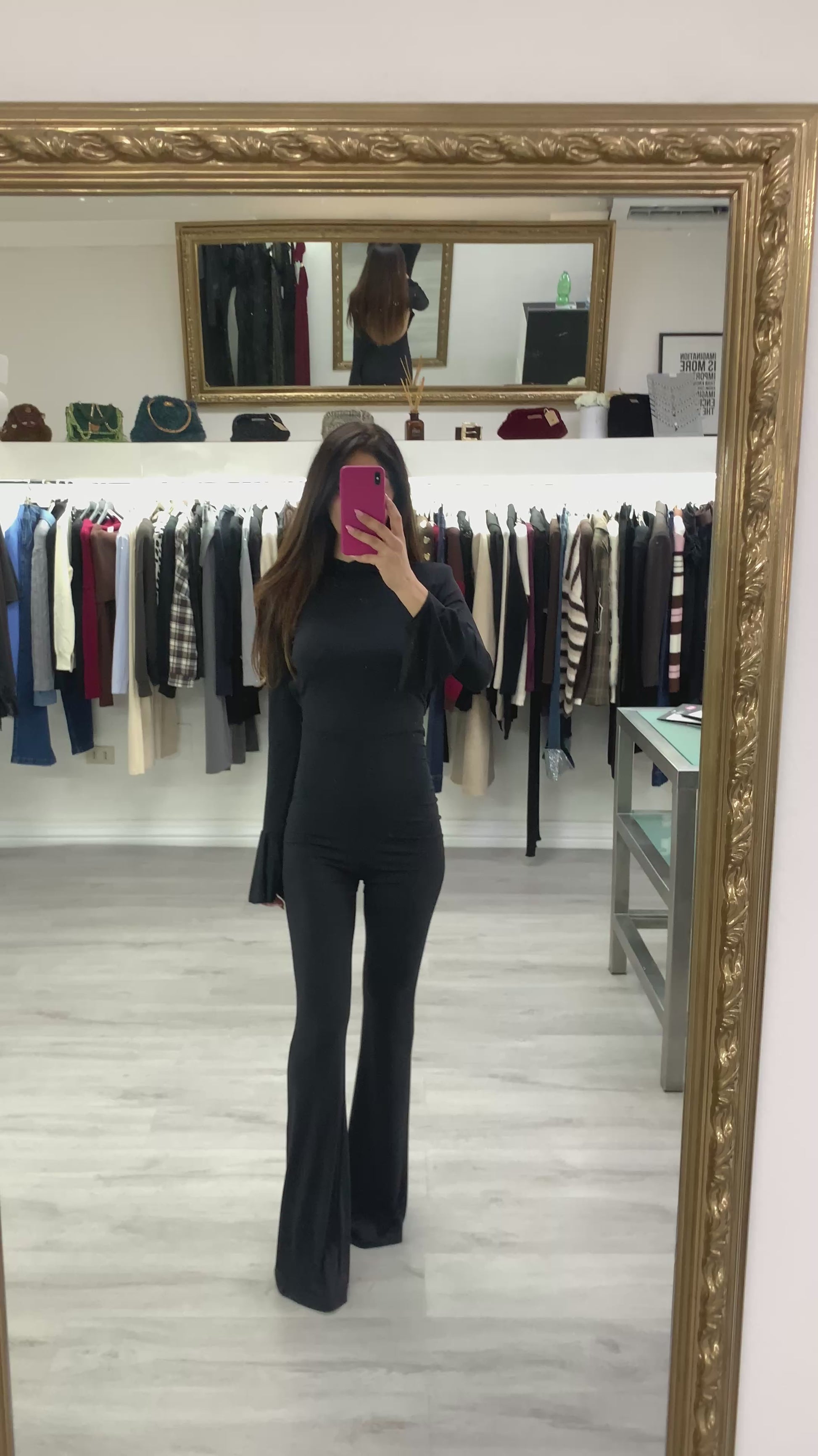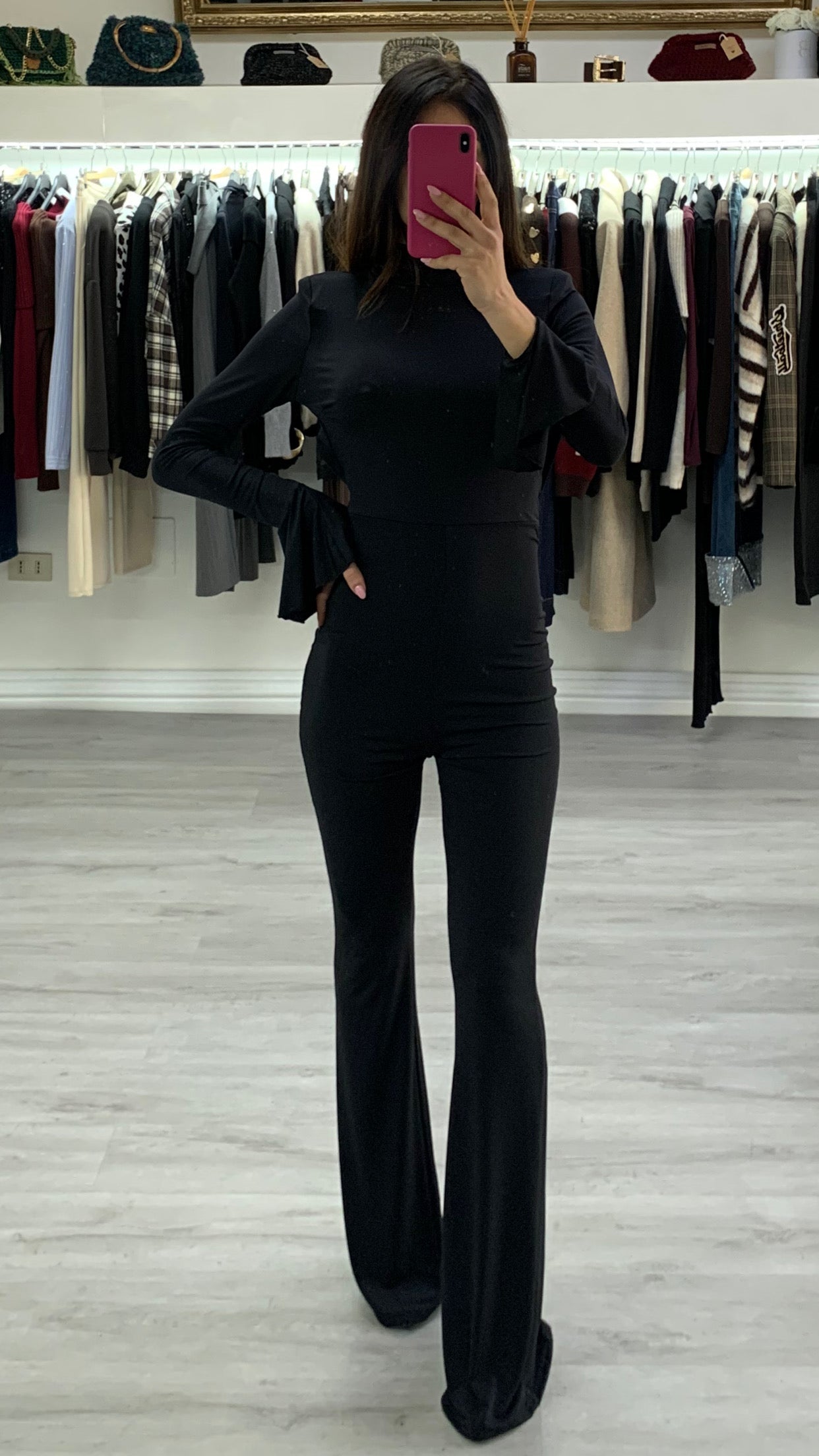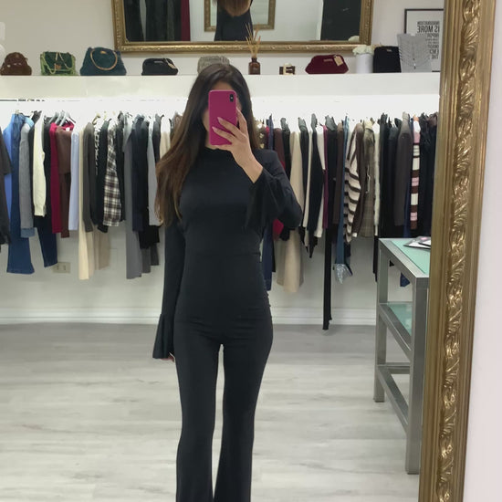 Tuta nera in lycra elasticizzata con maniche scampanate scollo sulla schiena e pantaloni a zampa Taglia unica